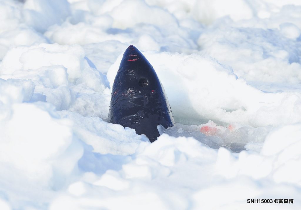 状況・経緯:[死亡・新鮮]小型の鯨類とみられる個体が押し寄せた流氷に閉じ込められているのを、標津町在住の漁業富森博さん(65)が発見。鯨類特有の噴気音に気付き、海岸から沖合約30㍍の流氷に覆われた海面から頭部のみを突き出した個体を確認。