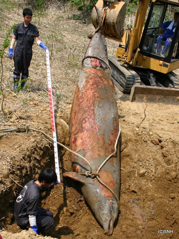 発見時状況:[生存]5月3日より発見者住宅地先付近にて生存漂流している鯨体が認められたが、5月4日朝に死亡している模様であったので、発見者が住宅地先斜路まで鯨体を移動させ、八雲町漁業協同組合を通じて八雲町に通報した。
